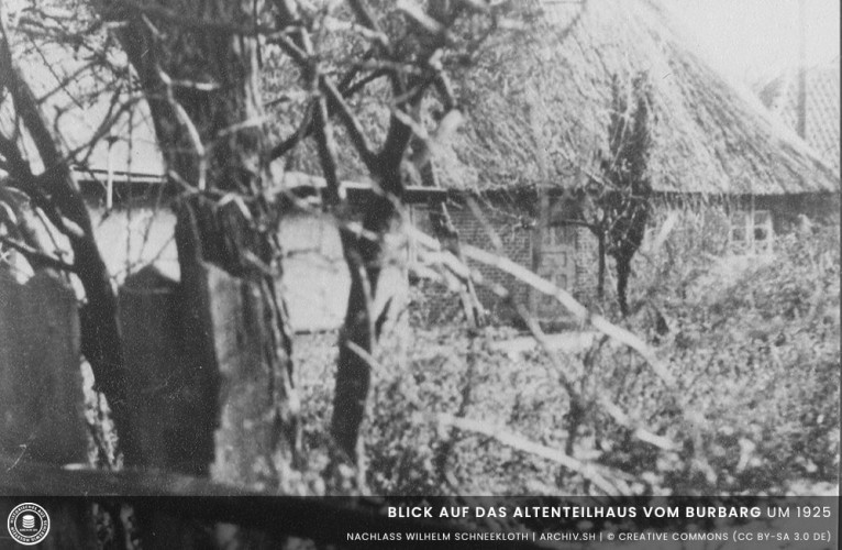 Der Blick auf den Hafen, vor einem lag die Wiese. Am Hang zum heutigen Stinnespark waren der Bauernteich und das Backhaus. Das Gelände soll in der Form gewesen sein, wie die Älteren noch die Hufe von Bauer Kähler in der Dorfstraße 4 kannten. Die Hufe wurde als erste nach 1876 verkauft. Einer der reichen Schütt aus Möltenort kaufte die Ländereien. Er war Kapitän, vertrug die Seefahrt nicht und wurde Bauer. Er baute sich seinen neuen Bauernhof am heutigen Stinnespark auf. Carl Friedrich Heinrich Kähler errichtete sich ein kleines Haus an der ehemaligen Kaiserstraße, baute darum eine Planke und trug seit dem den Beinamen "achter de Plank". Den Bauernhof auf dem Burbarg kaufte 1877 Friedrich Otto Bruhn. Er war Gastwirt, nebenbei Kätner und errichtete den Gasthof Friedrichshöh. Um 1880 ist der Gasthof im Besitz vom Kaufmann Hans Vollertsen, der ihn wahrscheinlich an einen Gastwirt mit dem Namen Johnsen verpachtete.