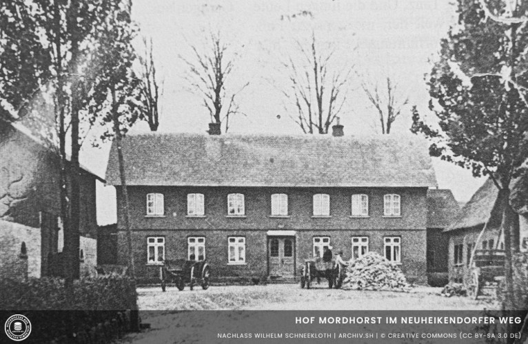 Der Hof Mordhorst gehörte einst zum Gut Schrevenborn und wurde von der Familie Steffen gepachtet. Er wurde vermutlich nach Leerstand, im Jahr 1852 von der Familie Schröder aus Meimersdorf gekauft. Jürgen Hinrich Schröder wird 1870 Bauernvogt in Neuheikendorf. Seine Tochter, Catharina Magdalena Schröder heiratet 1885 Johannes Friedrich Mordhorst. Dieser ist von 1906 bis 1928 der letzte Gemeindevorsteher von Neuheikendorf und erhält 1939 die Ehrenurkunde mit Ehrenbezeichnung als Altbürgermeister.