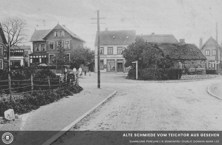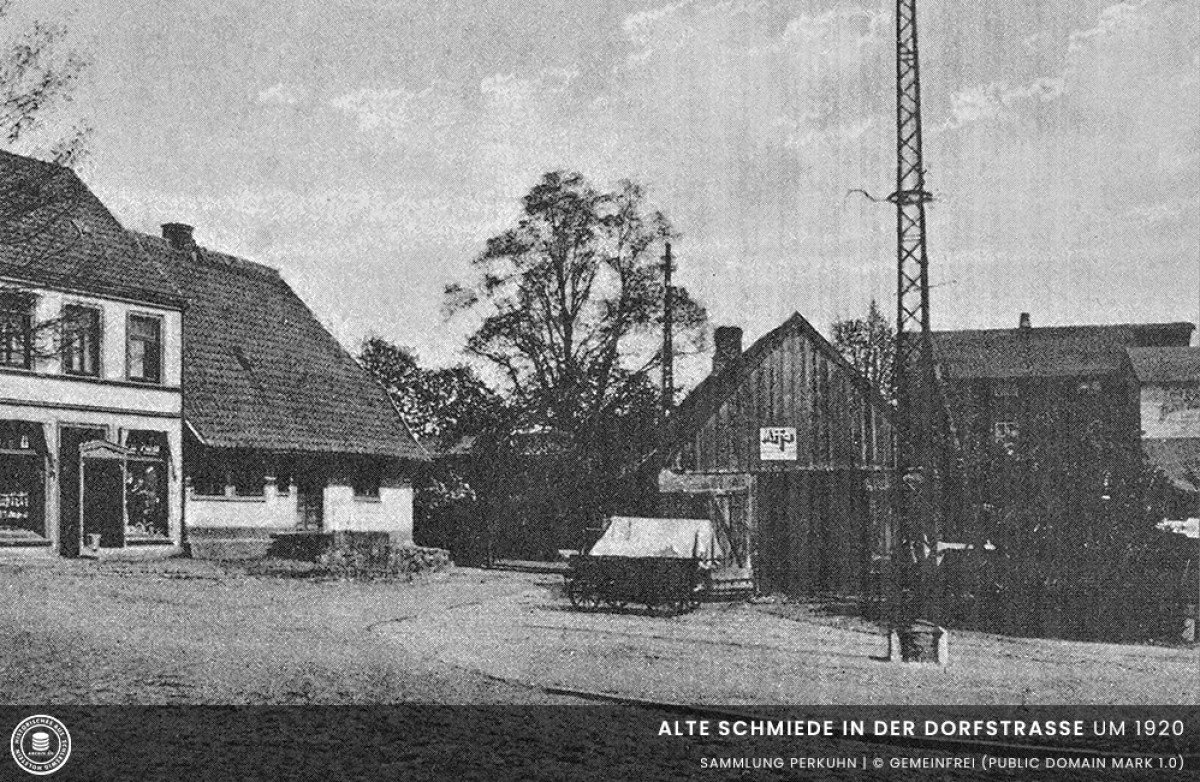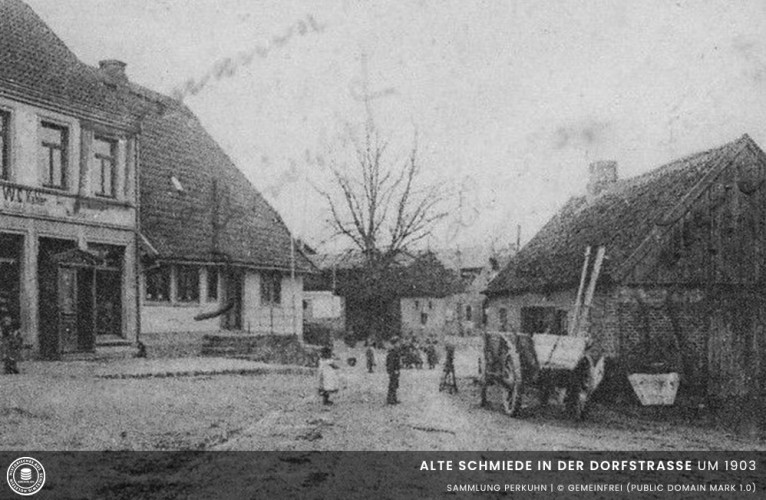 Erst nach der Aufhebung der Leibeigenschaft wurde es eine Schmiede. Bis dahin war die Hälfte zur Hafenstraße hin, das alte Feuerlöschhaus. Eine Spritze hat sie aber nie beherbergt. Die andere Seite zum Dorfkrug hin, war das Dorfbackhaus. Reste des alten Backhauses, des Backofens blieben erhalten, denn auf dem Sockel des Backofens war das Schmiedefeuer mit Blasebalg eingebaut.