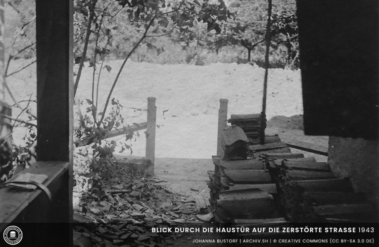 1943 Das Wohn- und Geschäftshaus an der Straße wird bei einem Bombenangriff beschädigt.